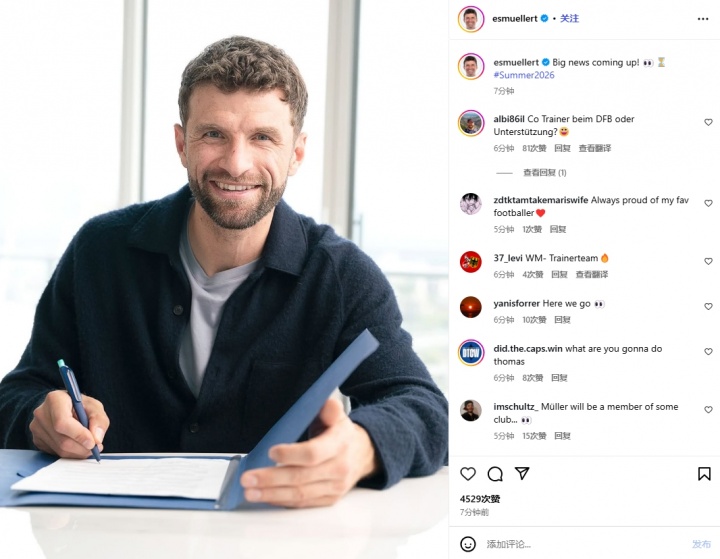 直播吧10月10日讯 穆勒今日在社媒更新了一条动态写道:重磅消息即将揭晓,并带上#2026夏天#的标签,引发了球迷们的无限遐想,有球迷在穆勒社媒下猜测他可能会以教练组成员的身份参加2026年世界杯。